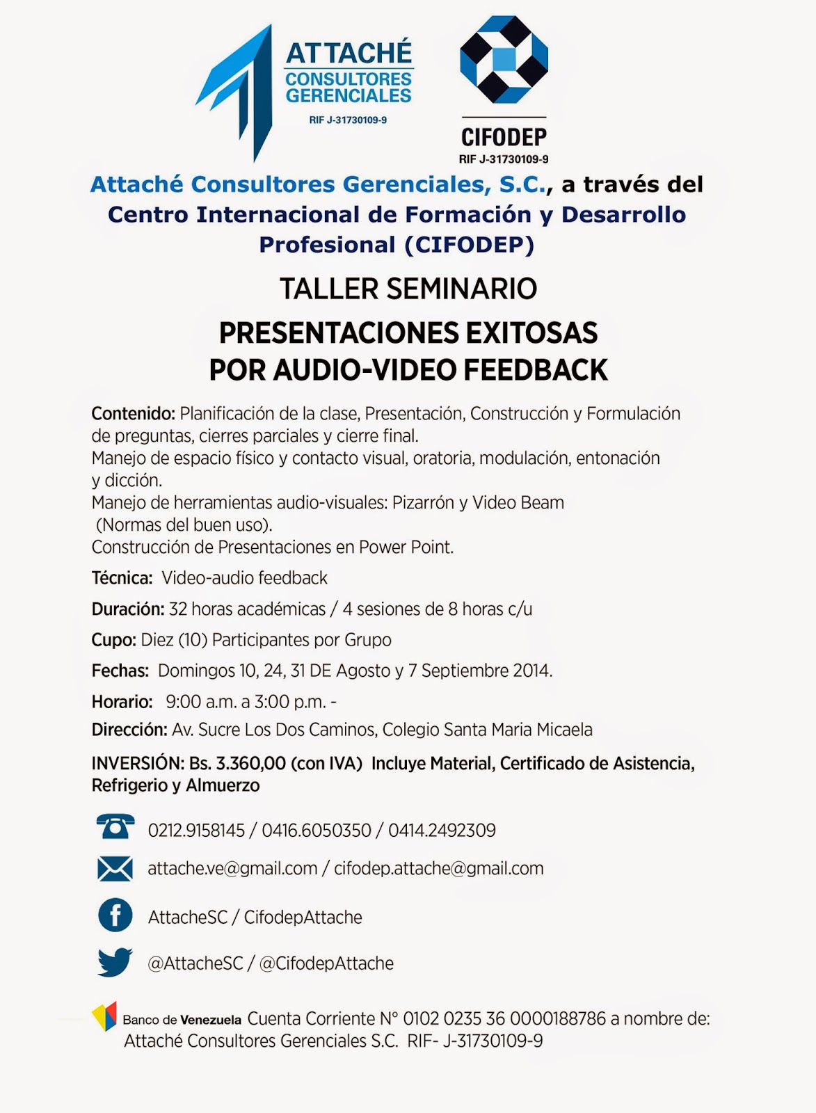 Depósito o Transferencia en la Cuenta Corriente del Banco de Venezuela No. 0102-0235-36-0000188786 a nombre de: Attaché Consultores Gerenciales, S.C. RIF J-31730109-9.